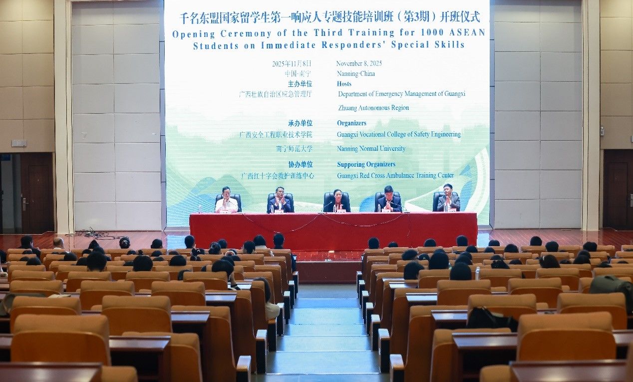11月8日至9日,由广西壮族自治区应急管理厅主办,我校与广西安全工程职业技术学院共同承办,广西红十字会救助训练中心协办的“千名东盟国家留学生第一响应人”专题技能培训班在我校五合校区开班。