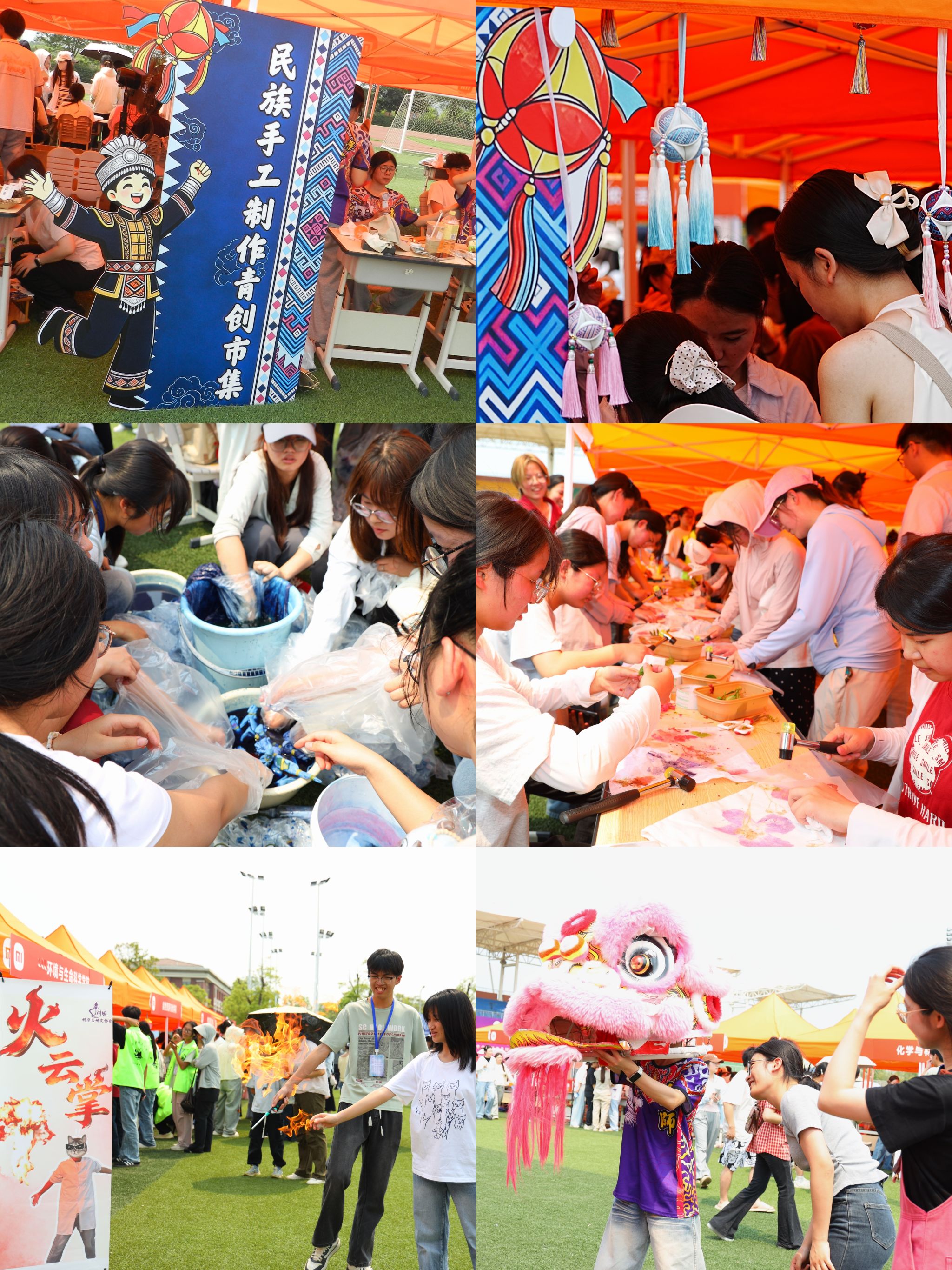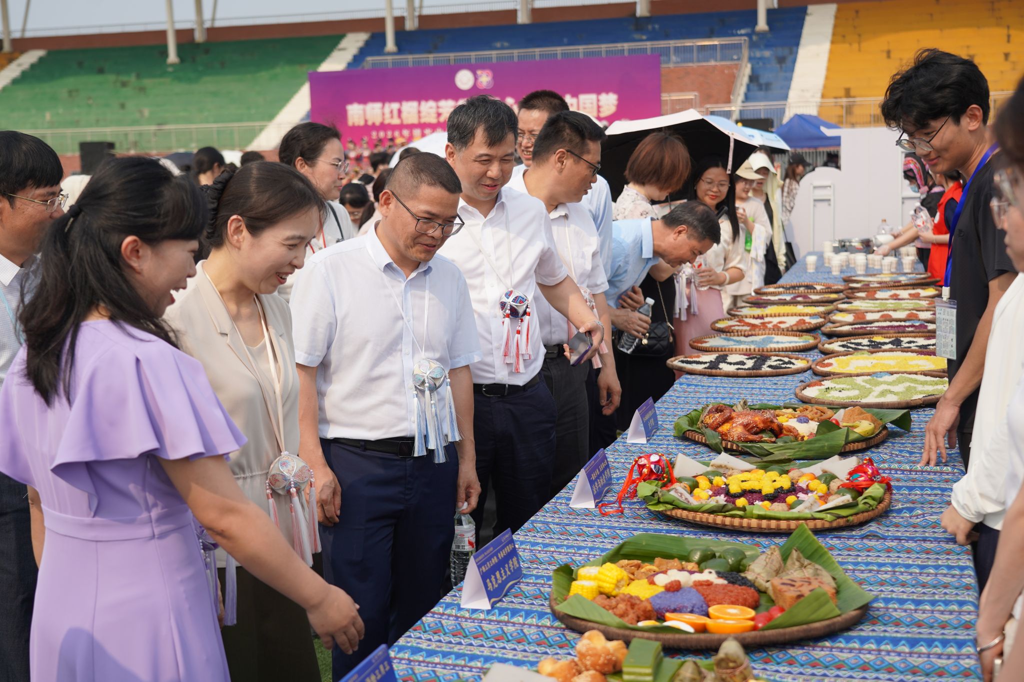 活动现场的互动体验区更是热闹非凡、趣味十足。民族非遗风情展示馆内,一件件精美的非遗展品整齐陈列,吸引着师生们驻足观赏、细细品味;民族手工青创市集的手工编织、植物拓染、刺绣等摊位前,师生们亲手制作,感受非遗技艺的匠心与温度;民族趣味运动会上,绣球投福接力、竹竿舞拼图接力、合力珠宝塔等项目一字排开,大家在协作互动中释放活力,感受传统体育乐趣;民族同心宴更是人头攒动,22个学院精心摆盘的簸箕宴整齐排列,五色糯米饭、艾草糍粑、豆腐酿等广西特色美食香气扑鼻。此外,22个学院还开设了“非遗剪纸与书法体验”“绣球DIY”“壮药香囊手作”等铸牢中华民族共同体意识系列公开课。整场活动中,师生们尽情欢歌、尽情体验,在沉浸式参与中触摸文化脉搏,在互动式体验中增进情感认同,在欢声笑语中凝聚团结力量,进一步推动铸牢中华民族共同体意识融入校园生活、根植师生心田。