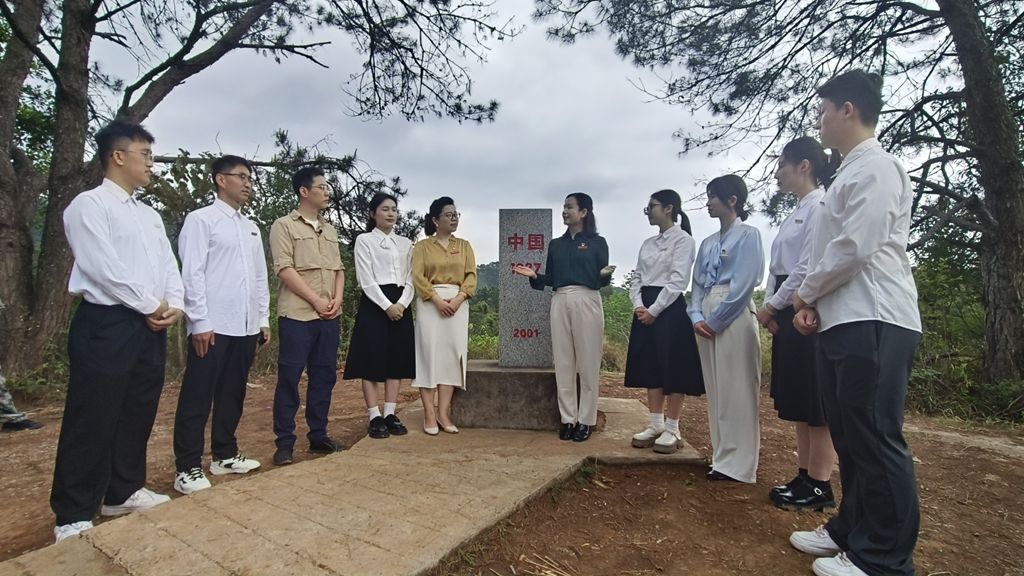 第四站,师生们共同来到那逢屯。宁明县爱店镇爱店社区那逢屯是一个离中越边境线约800米的小山村,村民们世代在此扎根,将守边护边视为使命与责任。我校唐英毅以三代戍边人潘武文的事迹为切入点授课。师生们在那逢屯参观了部分国防安全设施,并跟随潘武文在中越边境线上进行实地巡边。一位同学激动的说:“通过此次实地寻边,我真正感受到了边疆的艰苦和戍边人的坚守,作为一名边疆地区的大学生,我深感责任重大,必须努力提升自己,为国家发展和边疆稳定贡献自己的一份力量。”