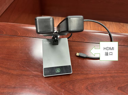 自带笔记本情况信号切换:在靠近屏幕的左前方会议桌和右后方会议桌上各有一根HDMI线,可插上自带的笔记本电脑,可自动切换为自带笔记本电脑的信号,如无法切换,可在机柜上小屏幕上单击笔记本按钮即可切换。
