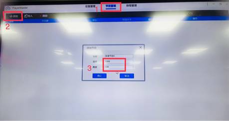 在软件界面中,点击“节目管理”,点击“添加”,添加节目宽度设为“1560”,高度设为“156”。点击确认。