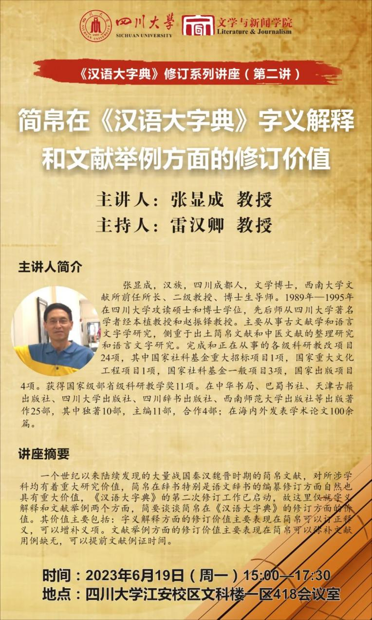《汉语大字典》修订系列讲座(第二讲)于2023年6月19日下午15:00至17:30在四川大学江安校区文科楼一区526会议室开展。西南大学博士生导师张显成教授作了题为“简帛在《汉语大字典》字义解释和文献举例方面的修订价值”的讲座。四川大学文学与新闻学院雷汉卿教授担任主持人。