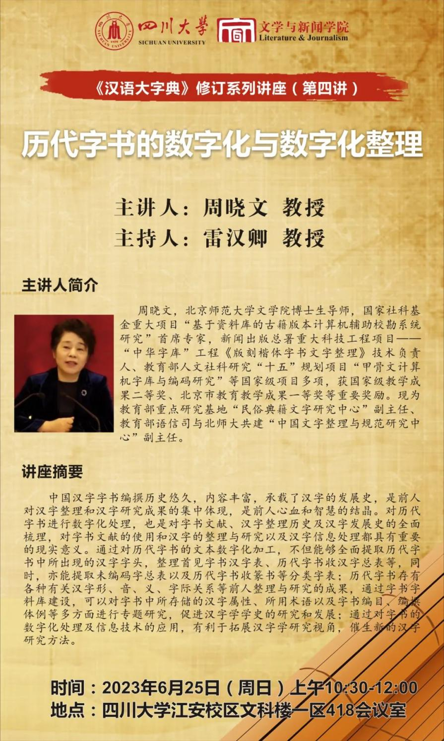 《汉语大字典》修订系列讲座(第四讲)将于2023年6月25日上午10:30至12:00在四川大学江安校区文科楼一区418会议室开展。北京师范大学文学院博士生导师周晓文教授将作题为“历代字书的数字化与数字化整理”的讲座。四川大学文学与新闻学院雷汉卿教授担任主持人。